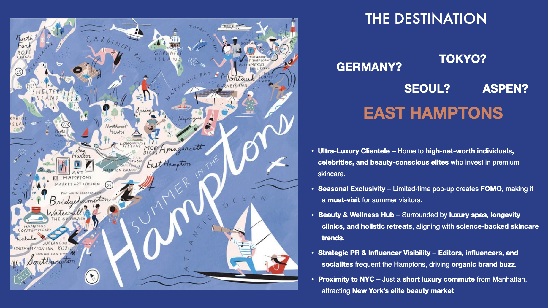 The Hamptons provides a concentrated seasonal audience with strong wellness engagement and a high appetite for premium skincare. Limited beauty retail saturation, combined with consistent summer footfall, makes it an ideal location for Augustinus Bader to create a controlled environment where the brand’s science and sensorial elements can be experienced directly.