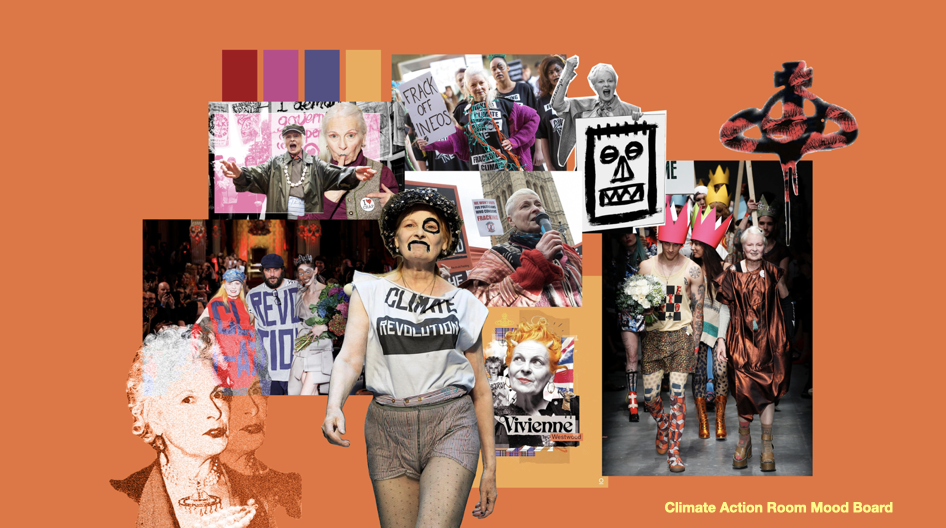 A dynamic digital wall displaying Westwood’s collective imagery, activism posters, and past collections.