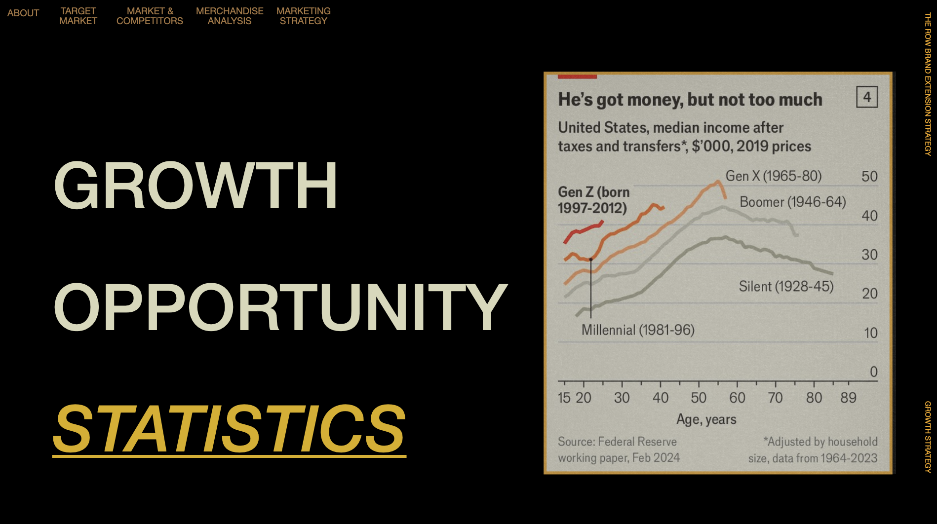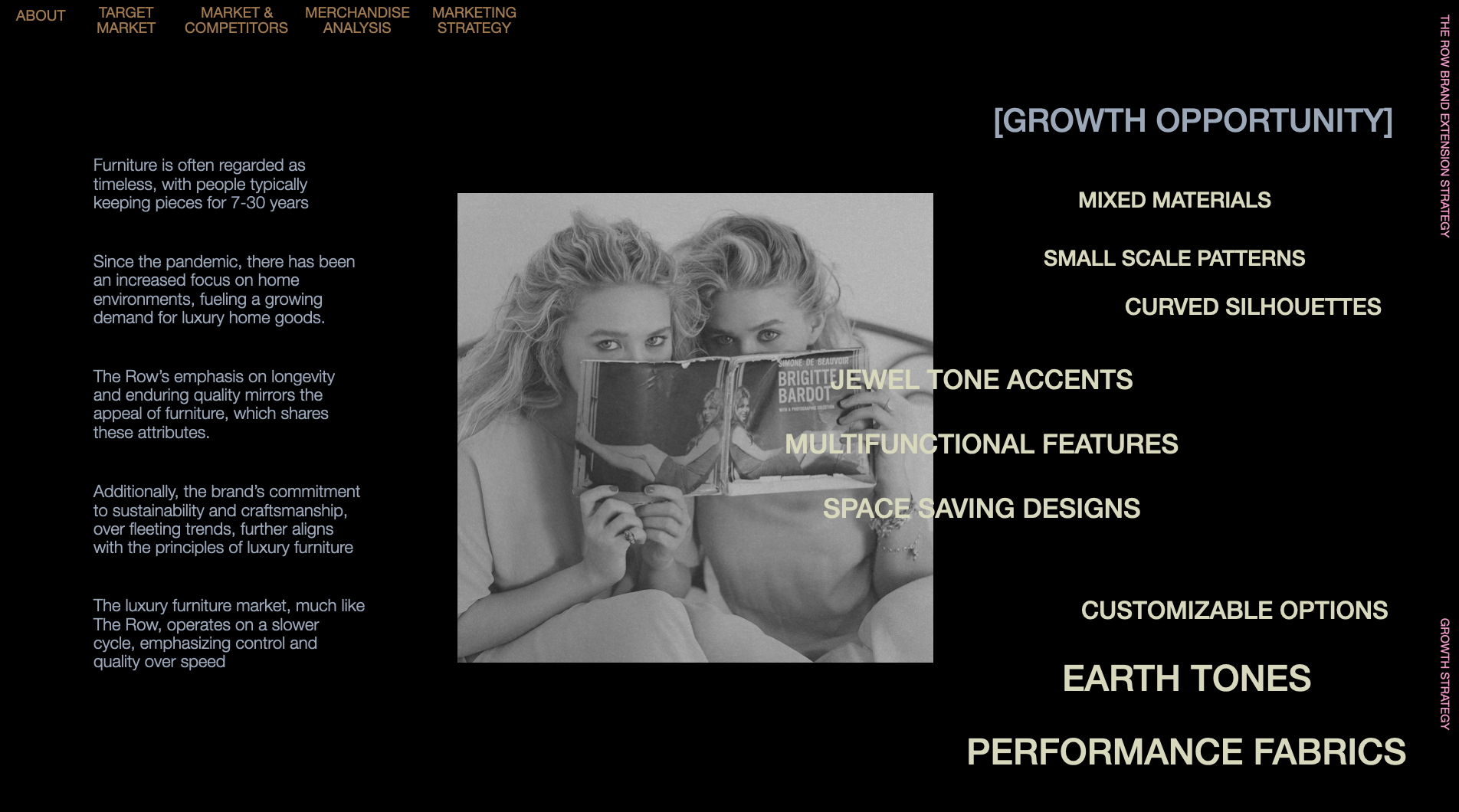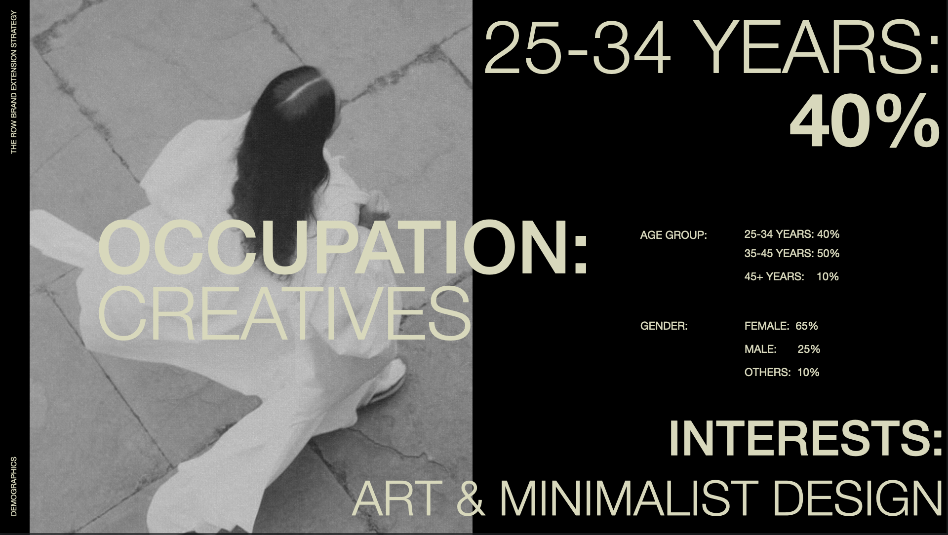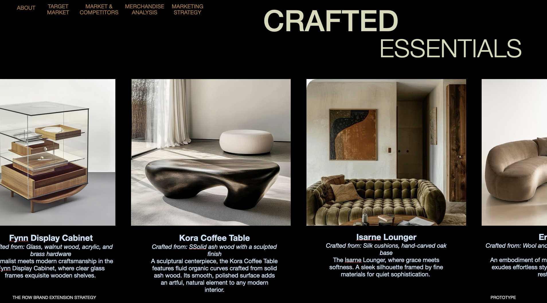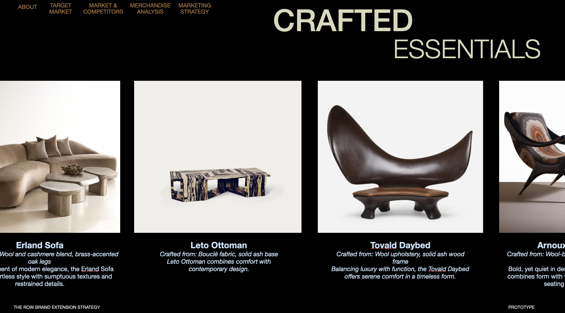 The primary audience consists of high-income Gen X and older Millennial consumers who already engage with The Row across fashion. This group values discretion, craftsmanship, and emotional connection to objects rather than novelty or trend-led consumption. They are design-aware, culturally literate, and often invest across fashion, art, and interiors. For this consumer, furniture becomes an extension of personal identity and lifestyle, making The Row a natural choice beyond apparel.